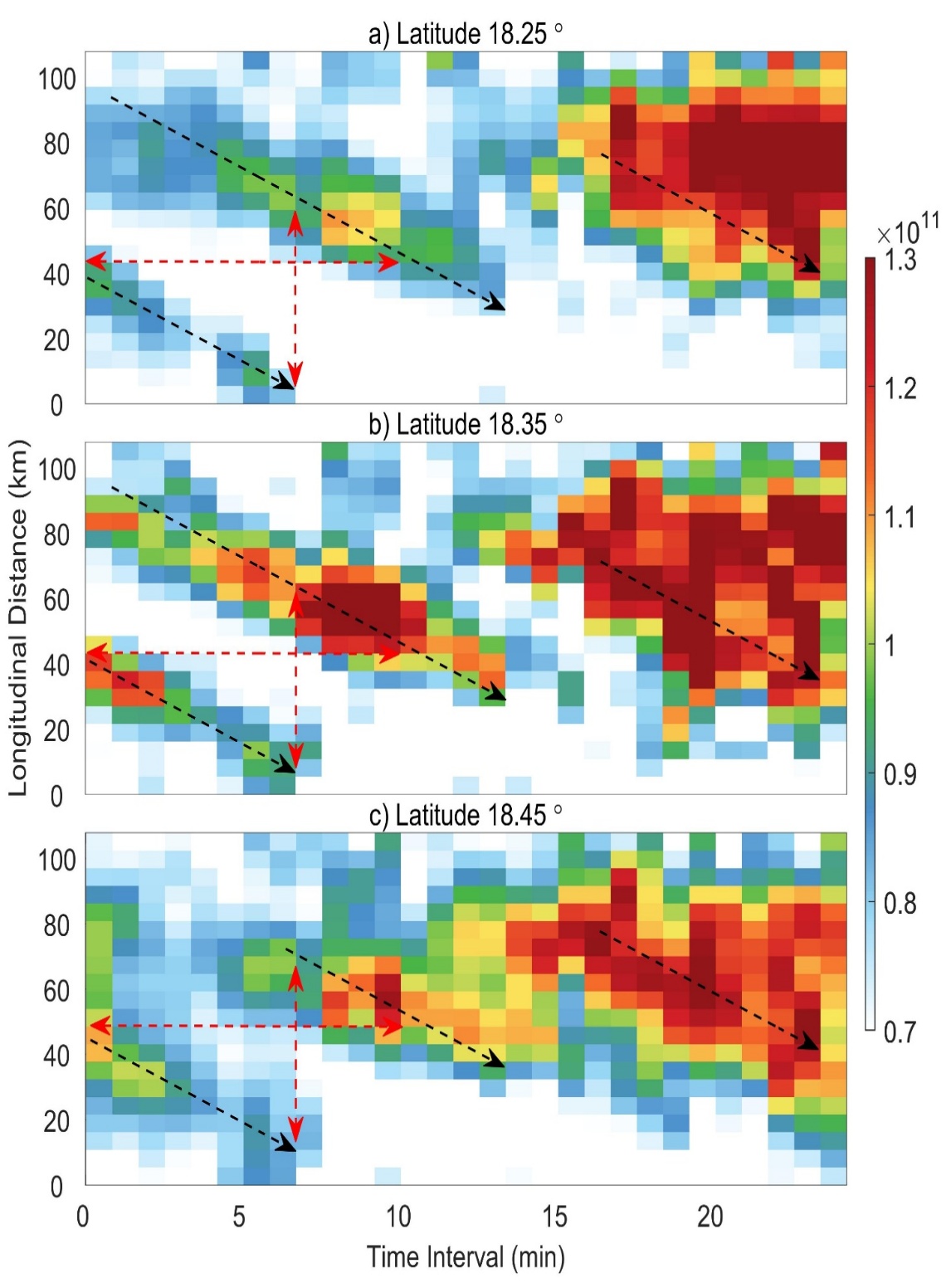 图 2024年9月27日03:45:57(世界时)起,三亚非相干散射雷达在三个不同纬度、同一高度捕获的Es层波动结构的水平漂移;黑色箭头表示Es层随时间变化的运动轨迹,红色双箭头表示波状结构的水平波长和周期