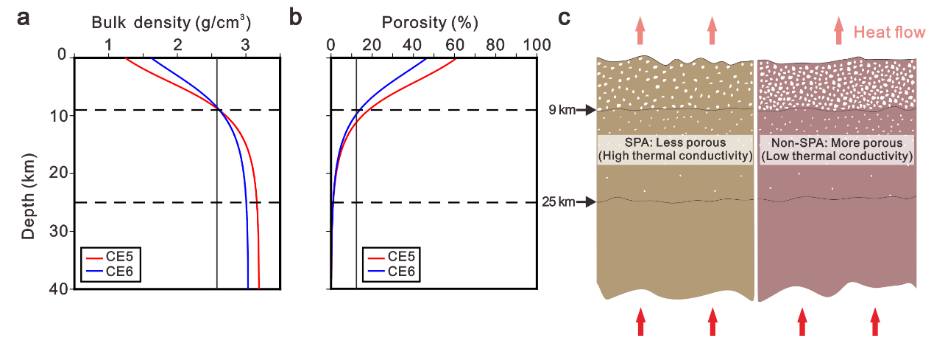 图3 嫦娥5号和嫦娥6号采样点下方的体密度(a)和孔隙度(b)的垂向变化,以及不同的孔隙度结构可能对月球散热的影响(c)