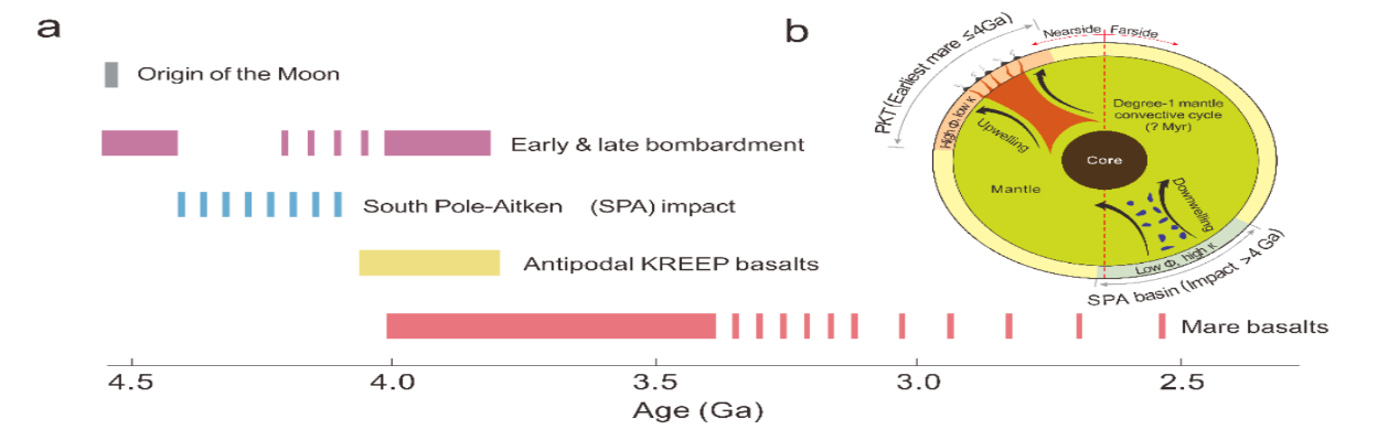作为月球最外层的结构,月壳对月球内部热量的传导作用类似于热毯效应,其物性的横向和垂向差异可显著影响月球不同区域的冷却效率。通过测量不同采样点区域的孔隙度与热导率,可建立两者的经验关系,然后将嫦娥6号的孔隙度测量结果应用于这一经验关系,发现南极-艾肯盆地的热导率较月球近侧风暴洋区域的热导率高一个数量级(图4)。该结果与嫦娥4号轨道器观测的结果相近,这说明相较于南极-艾肯盆地,月球的近侧可以保持更长时间的内部热量,从而导致更慢的冷却速度和更长期的火山活动(图5)。此外,南极-艾肯盆地低孔隙度引起的热损失增强可能加速了该地区岩石圈的增厚,与近侧风暴洋区域相比,进一步促进了该地区火山活动的减弱。这些月球不同区域的差异冷却模型为未来的热流测量提供了预测,并可能解释月球不同区域的火山爆发的不同持续时间。