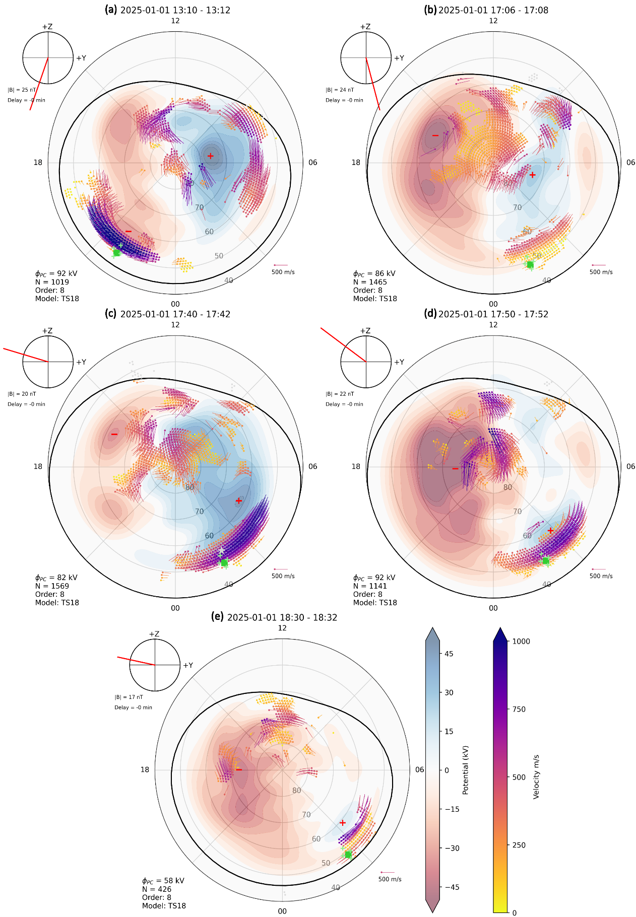 图3 基于高频雷达观测网得到的极区对流图。矢量的颜色和长度分别表示拟合得到的对流速度强度。绿色方框表示漠河FPI的位置,其附近的“+”标记表示FPI各个视场方向的位置投影。c、d两幅图中的灰色五角星表示极光照片中快速演化高亮极光区域的大致投影位置