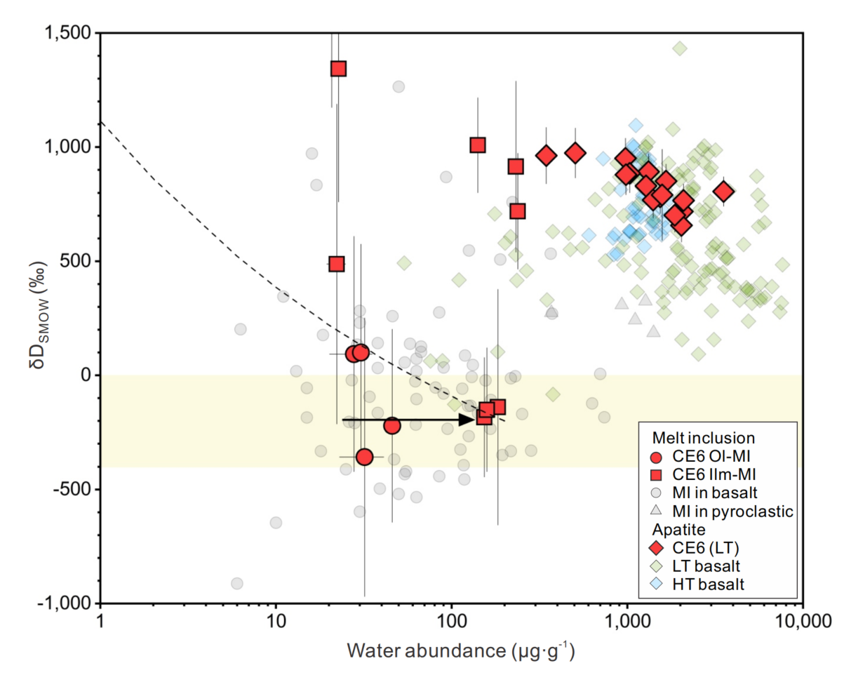 3 嫦娥六号玄武岩样品熔体包裹体和磷灰石的水含量及氢同位素组成。橄榄石中熔体包裹体具有最低的水含量和最轻的氢同位素组成。钛铁矿中的熔体包裹体水含量和氢同位素组成变化范围较大。磷灰石具有结构水故而具有相对高的水含量,对应有最重的氢同位素组成