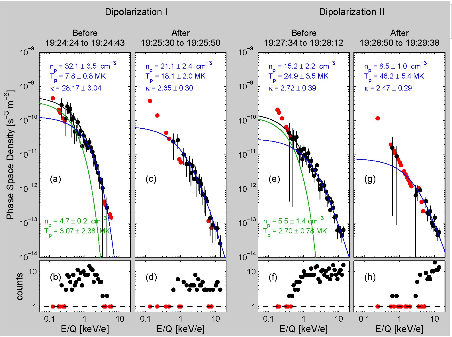 水星信使号(MESSENGER)探测器于2009年至2015年在轨水星,其16个水星年的在轨数据为本研究提供了必要条件。本研究首先使用信使号测量得到的质子数据(能量范围在~ 0至13个千电子伏, keV),对水星磁层亚暴两个偶极化前后的质子分布进行了拟合(如图1所示)。以第一个偶极化过程为例,偶极化之前,高能部分质子热力学温度为7.8±0.8兆开尔文(MK) ,κ为28.17±3.04;偶极化发生之后,质子热力学温度为18.1±2.0兆开尔文(MK) ,κ为2.65±0.3。此结果清晰的表明,水星亚暴偶极化过程可以非常有效的加热(热力学温度升高)和加速(κ降低)质子。第二个亚暴偶极化的结果进一步证实了这一结论。