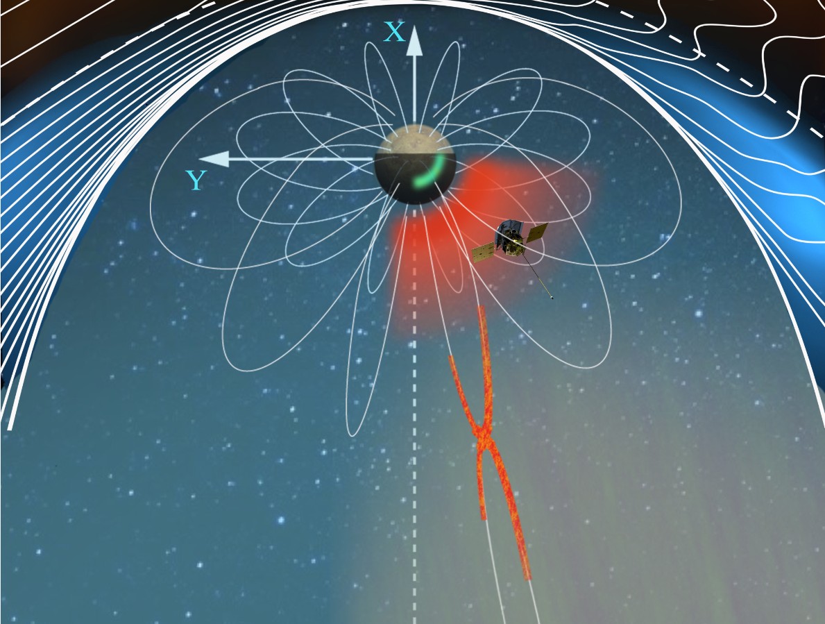 图2. 水星磁尾动力学过程示意图。水星近磁尾偶极化过程多在晨侧发生,造成质子温度和超热质子通量在晨侧较高(近水星红色区域)。同时水星的近磁尾重联(红色X线)及X-射线极光(水星上的绿色弧)也更多的在晨侧被观测到。