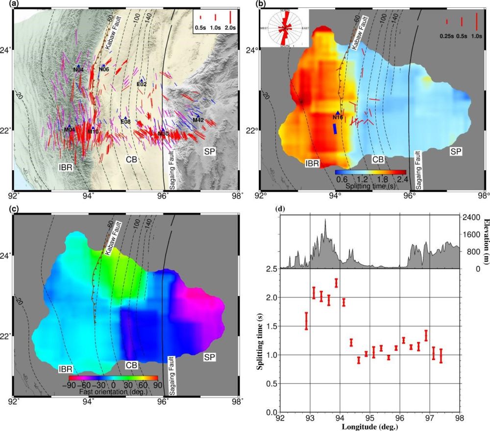 中国科学院地质与地球物理所地球与行星物理院重点实验室博士生范恩博与导师艾印双研究员、何玉梅研究员及美国密苏里科技大学Stephen S. Gao教授等人,基于2016年地质地球所和缅甸地球科学学会、青藏高原研究所合作在缅甸中部布设的该国第一个密集流动地震台阵所采集回的高质量数据(图1b),在XKS震相剪切波分裂分析的基础上,辅以近震直达剪切波分裂和接收函数中Pms震相分析,系统研究了该区域各向异性的空间变化和主要来源深度,初步建立了研究区深部动力学模型。