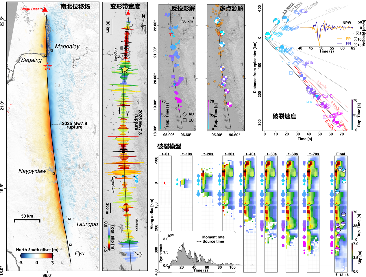 研究成果发表于国际学术期刊Science(韦生吉,王新,李成龙,曾洪玉,马张烽,施其斌,陈晗,黄一荷,吕明哲,廖江涛,杨顺,白一鸣,Phyo Maung Maung,Kyawmoe Oo,Yin Myo Min Htwe,张建勇,Luca Dal Zilio,单新建,陈凌. Supershear rupture sustained through a thick fault zone in the 2025 Mw 7.8 Mandalay earthquake[J]. Science,2025. DOI: 10.1126/science.adz2101.)。研究受国家自然科学基金(NSFC92355001)等资助。