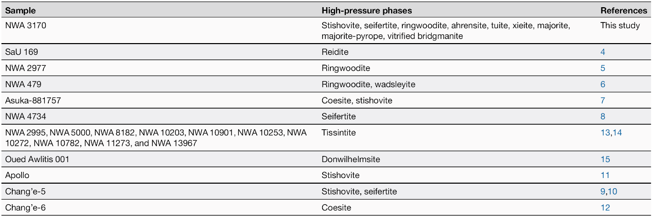 中国科学院地质与地球物理研究所电子显微镜实验室谷立新高级工程师、行星科学与前沿技术重点实验室林杨挺研究员、深层油气理论与智能勘探开发重点实验室李金华研究员及团队成员,通过先进的电子显微学技术结合拉曼光谱,在月球陨石NWA 3170样品中发现了大量新的高压矿物相(表1)。这一发现革新了月球样本中高压矿物形成和保存的认知。