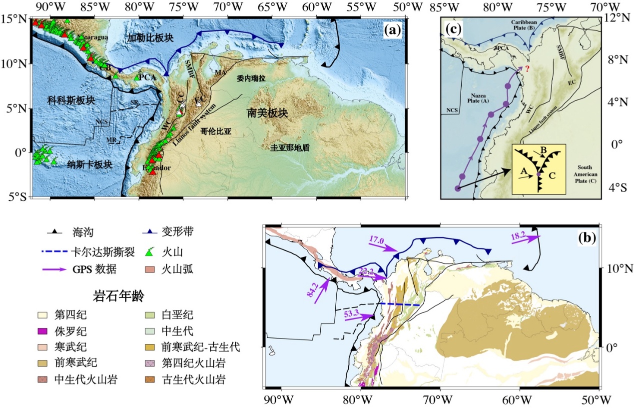 图1 哥伦比亚及邻近区域地表地形、主要构造和地质特征分布。 (a) 图中灰色线为海岸线,黑色线为主要的断层和洋脊分布 (Veloza et al. 2012),带三角形的蓝色和黑色实线表示了此区域的变形带和俯冲带,蓝色虚线标志着卡尔达斯撕裂位置 (C. A. Vargas & Mann, 2013),地表火山有三种类型,分别以不同颜色的三角符号表示:休眠火山(白色三角形)、1百万年以来的活火山(绿色三角形)和2023年仍有喷发记录的火山(红色三角形)(Venzke, 2023)。主图右上角为研究区域在全球地图上的展示; (b) 显示了区域构造简图,左侧为对应图例,紫色箭头表示纳斯卡板块、科科斯板块和加勒比板块相对于稳定的南美板块的 GPS 运动速度矢量(mm/年),相应的速度矢量值被标在箭头上方 (Jarrin et al., 2023; Mora-Paez et al., 2019);(c) 纳斯卡-加勒比-南美板块三联点(紫色圆圈)的类型及其随地质年代的迁移轨迹。图中主要构造名称缩写如下:WC:西科迪勒拉山系;CC:中科迪勒拉山系;EC:东科迪勒拉山系;SMBF:圣玛尔塔-布卡拉曼加断层;MA:梅里达安第斯山脉;巴拿马-乔科弧:巴拿马-乔科弧;CB:乔罗特加地体;NCS:纳斯卡-科科斯扩张中心;SR:桑德拉洋脊;MR:马尔佩罗洋脊