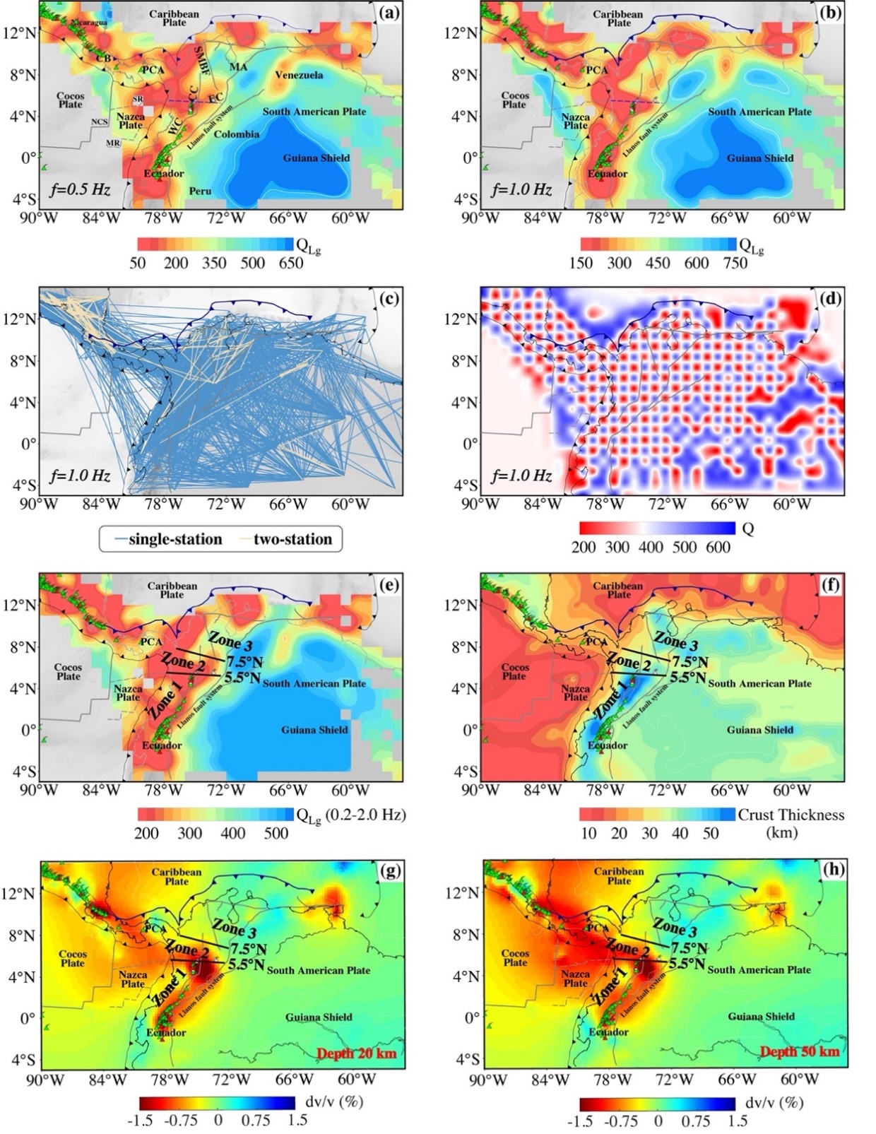 中国科学院地质与地球物理研究所行星科学与前沿技术重点实验室地震学学科组的博士研究生刘真、导师赵连锋研究员、美国加州大学圣克鲁兹分校的谢小碧研究员、哥伦比亚国立大学的Carlos A. Vargas教授与其他合作者一起,利用哥伦比亚及邻近区域布设的高密度地震台阵观测数据,采用单双台联合反演方法,构建了高分辨率(~1°×1°)的宽频带 (0.05–10.0 Hz) 地壳Lg波Q值模型(图2),揭示了板块俯冲系统之下的地壳热异常分布,并据此推测了隐没三联点的可能位置。