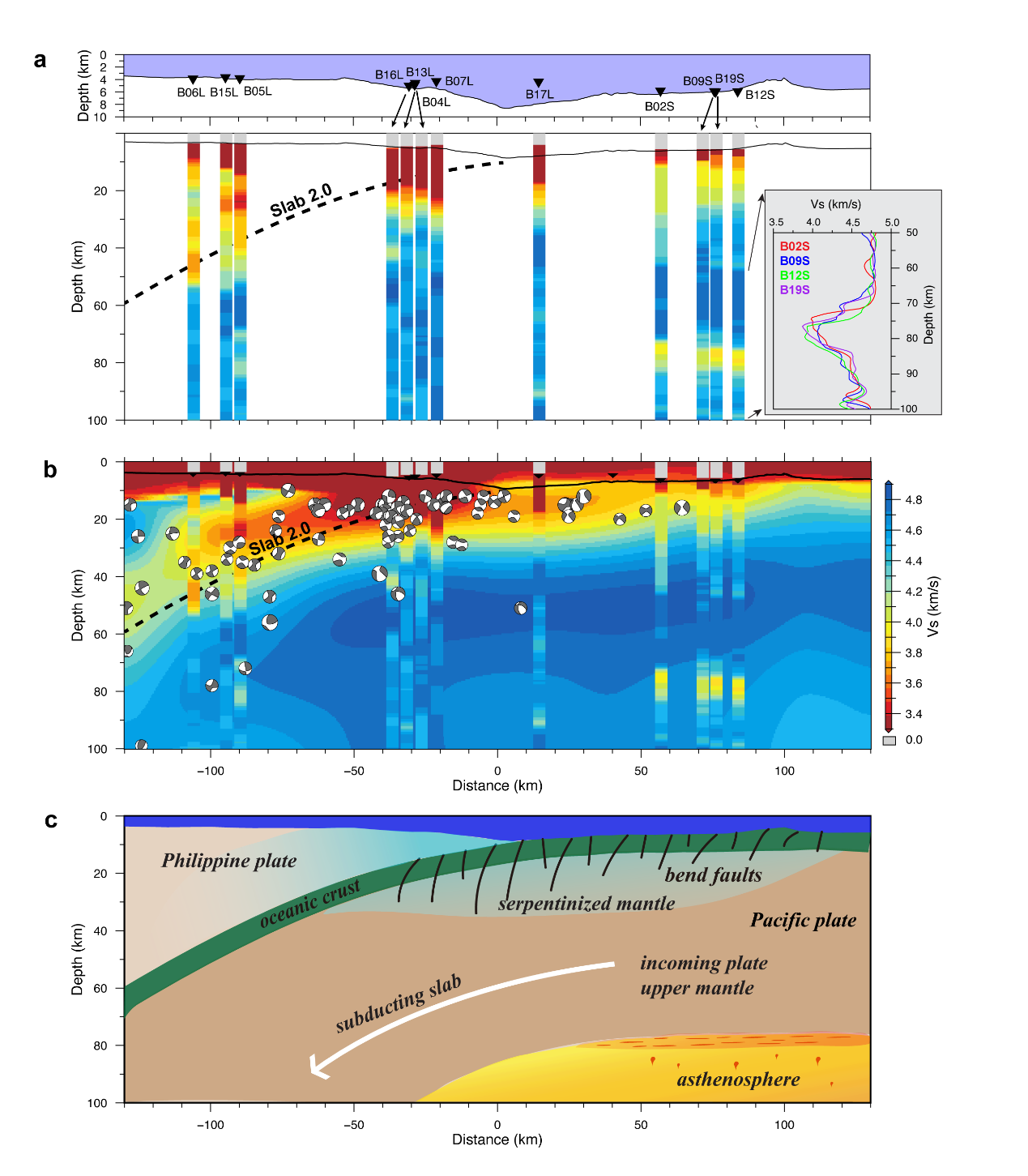 马里亚纳俯冲带作为典型的大洋俯冲系统(图2),具有年龄古老、富水性强等特征,为研究俯冲带深部水循环及 LAB 结构提供了天然窗口。然而,由于海底地震仪(Ocean Bottom Seismometer,OBS)的稀疏部署以及海底高噪声环境、海水和沉积物的影响,许多陆地地震学方法难以直接应用,而需要面向OBS数据的方法来提升海底地下精细结构成像能力。