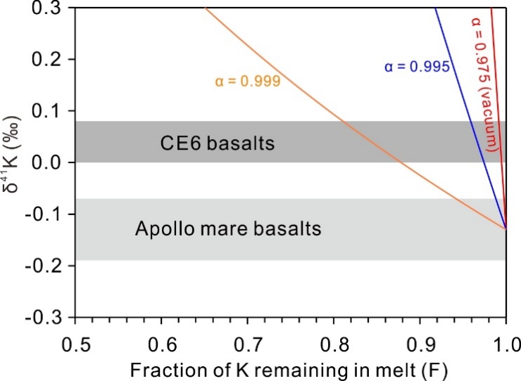 (3)SPA形成时的大撞击造成了挥发分的丢失。前人通过对阿波罗样品和对来源不同的大量玄武岩和镁质岩套陨石进行分析,发现它们具有相似的K同位素组成,据此提出形成月球的大撞击导致了全月尺度的挥发分丢失,并形成了一致的同位素特征。因此,我们认为嫦娥六号玄武岩重K同位素特征并非源于月幔不均一性,而很可能与SPA撞击事件有关。利用Fe-K同位素体系,研究团队排除了小行星直接加入导致同位素偏重的可能性。最后提出,SPA撞击很可能引起月幔物质挥发,模拟计算显示约1%的K丢失即可解释玄武岩的重K同位素组成(图4)。