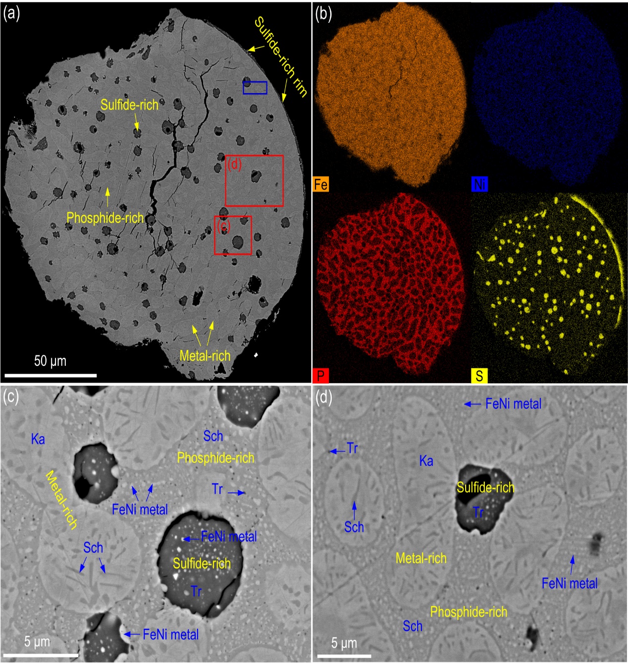 研究团队在嫦娥五号月壤中发现了一颗具有独特不混溶结构的铁镍金属熔珠,该金属熔珠富含P和S,其内部由大量富金属(Fe-Ni)球粒、富硫化物球粒及富磷化物基质三部分构成(图1)。富金属球粒呈(扁)球型/哑铃型,表现出聚集融合的特征;富磷化物基质则以网状基质的形式充填于富金属球粒之间;富硫化物球粒主要呈球形,散布于富磷化物基质中。该结构与Fe-P-S三元体系的高温高压熔融淬火产物非常相似。
