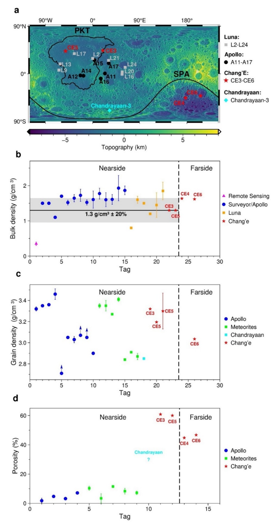 图1 嫦娥6号及其他月球探测任务(图a为任务着陆点)测量得到的月球表面体密度(b)、物质密度(c)和孔隙度(d)