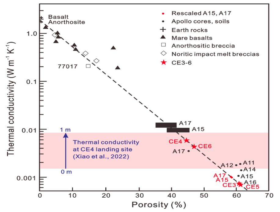 作为月球最外层的结构,月壳对月球内部热量的传导作用类似于热毯效应,其物性的横向和垂向差异可显著影响月球不同区域的冷却效率。通过测量不同采样点区域的孔隙度与热导率,可建立两者的经验关系,然后将嫦娥6号的孔隙度测量结果应用于这一经验关系,发现南极-艾肯盆地的热导率较月球近侧风暴洋区域的热导率高一个数量级(图4)。该结果与嫦娥4号轨道器观测的结果相近,这说明相较于南极-艾肯盆地,月球的近侧可以保持更长时间的内部热量,从而导致更慢的冷却速度和更长期的火山活动(图5)。此外,南极-艾肯盆地低孔隙度引起的热损失增强可能加速了该地区岩石圈的增厚,与近侧风暴洋区域相比,进一步促进了该地区火山活动的减弱。这些月球不同区域的差异冷却模型为未来的热流测量提供了预测,并可能解释月球不同区域的火山爆发的不同持续时间。