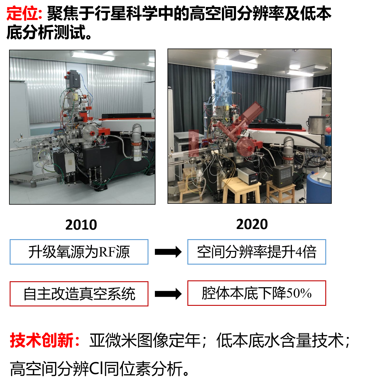 纳米离子探针实验室聚焦于行星科学中的高空间分辨率及低本底分析测试。面对此需求,近年来对仪器硬件系统进行升级、改造。升级氧源为RF源空间分辨率提升4倍。实验室自主改造真空系统,将腔体本底下降50%